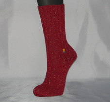 Modell 440 Material: Handgedrehte Wolle mit Baumwolle und goldenes Lurex. „Brennendes Herz“ Etwas ganz Besonderes: Am Knöchel einer Socke ist ein „Charm“ eingestrickt: Ein kleines gelbes Herz auf einem silbernen Blatt. Die Wolle ist herrlich weich und anschmiegsam, in zwei aufeinander abgestimmten Orange-Rot-Tönen, die wunderbar durch den goldenen Lurexfaden ergänzt werden. Bumerang-Ferse und verstärkte Spitze. Handwäsche empfohlen. Sofort lieferbar in Größe 38/39 |